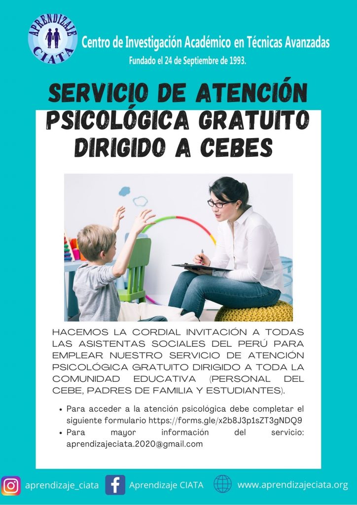 Aprendizaje CIATA está brindando apoyo a los Centros de Educación Básica Especial (CEBE). Por ello, en colaboración con la asistenta social del CEBE, se le facilita el servicio de atención psicológica para toda la comunidad educativa (personal, padres de familia y estudiantes). Si desea ser atendido, llene el formulario que aparece a continuación, y unos de nuestros representantes se podrá en contacto con usted en la brevedad posible.
